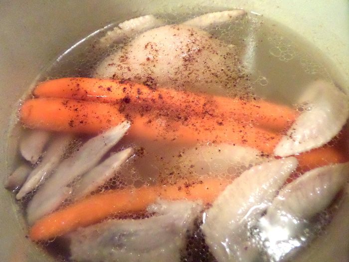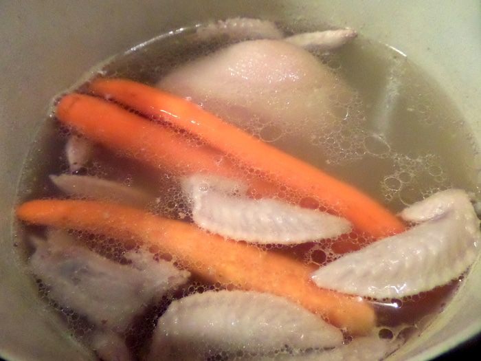 Примерно через 1,5-2 часа варки рульки добавляем крылышки и морковку. Подливаем воды.