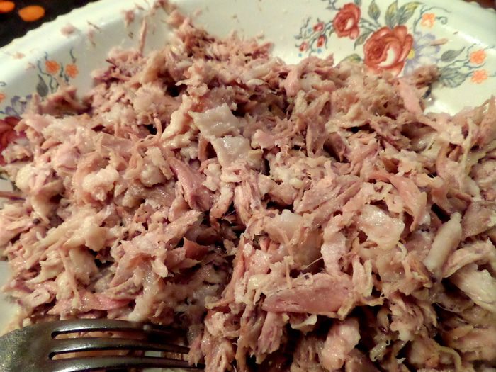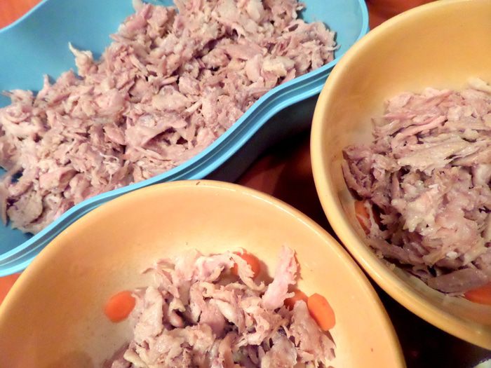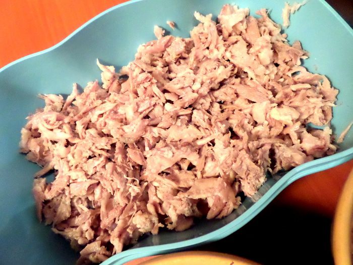 Начинаем теребить мясо на волокна. Мне нравится это делать руками,так получается однороднее и нежнее))) Кожу всю выбрасываю,но кто любит-можно и её порезать.