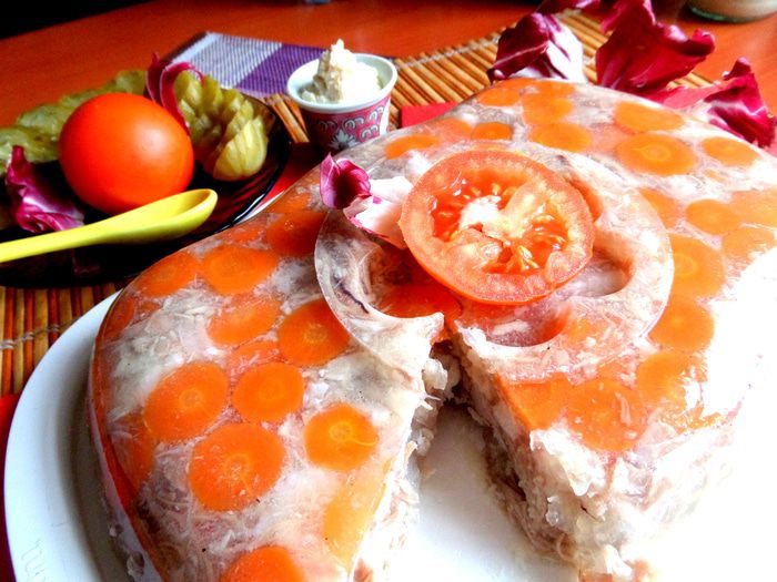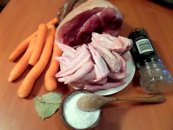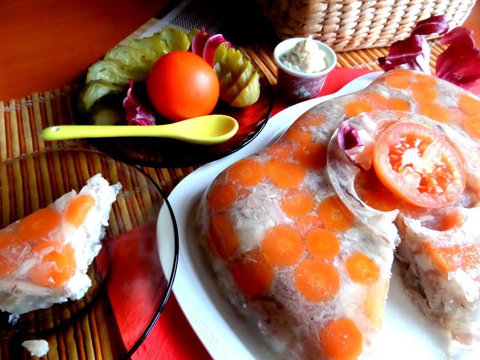 Холодец я делаю необязательно на праздники...,а когда взгляд упадёт на красивую рульку))) А благодаря добавлению крылышек получается очень нежный вкус и устойчивое "желе"! Только не забудьте купить баночку хрена)))