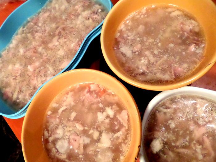 Высокий слой желе я не делаю, а излишки бульона идут на суп. На этот раз сварила фасолевый, добавив воды, конечно)))