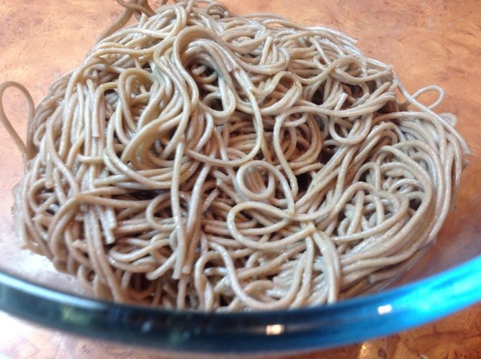 В лапшу добавляем кунжутное масло, соевый соус и уксус. А также перемешиваем вместе с овощами.