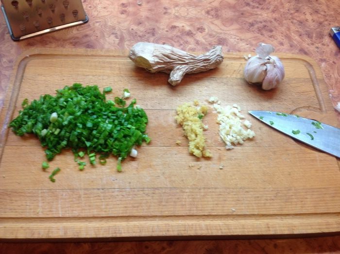 Измельчаем чеснок,лук, имбирь. Обжариваем в сковороде на кунжутном масле.