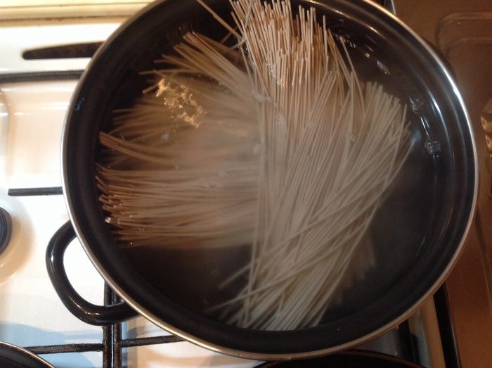 Отвариваем лапшу 7 мин на медленном огне. Сливаем воду.