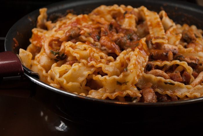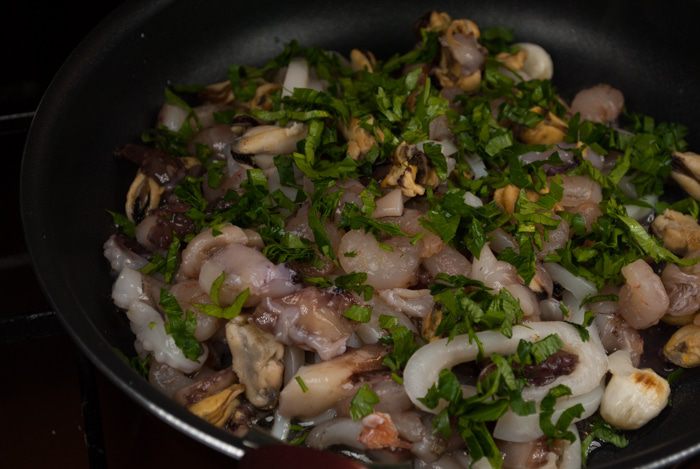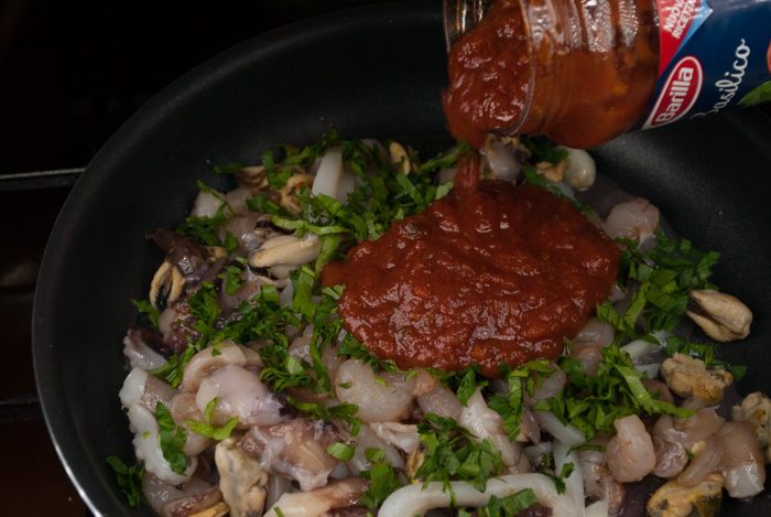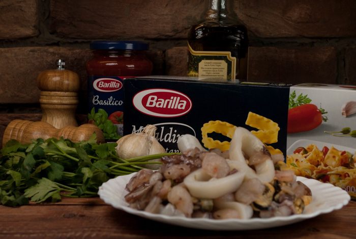 Сварить пасту до полутвердого состояния (альденте) в кастрюле со слегка подсоленной кипящей водой. Слить воду, смешать пасту с соусом из морепродуктов, переложить на алюминиевую фольгу, завернуть в виде свертка и запекать в духовке при температуре 200°C около 5 мин. Готовую пасту сразу подать на стол.