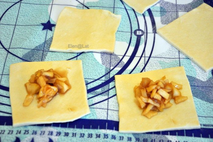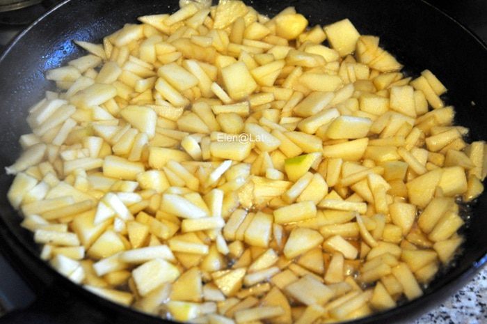 Сначала готовим начинку. Для этого в сковороде растопить сливочное масло и добавить сахар, как только сахар начнет карамелизироваться, добавить яблочки. Тушить, помешивая. Когда яблочки станут мягкими и красивого янтарного цвета, они готовы. Переложить в миску и остудить.