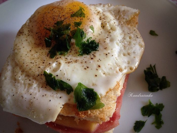 Представляю Вашему вниманию французкий бутерброд 'Крок-мадам'. Нежный хруст тостов вместе с сочной начинкой передать словами невозможно.