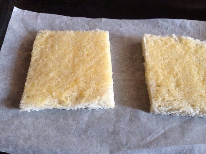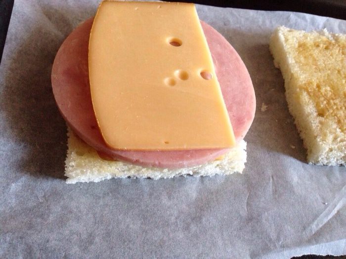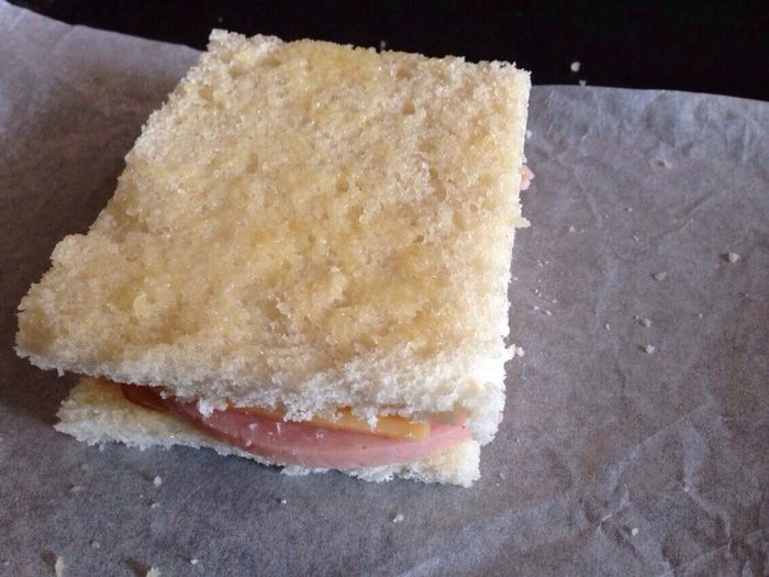 Накрыть оставшимся ломтиком хлеба, смазать сливочным маслом. И отправить запекаться в духовку на 5 минут, при температуре 180 градусов. Затем перевернуть и поставить еще на 5 минут в духовку.