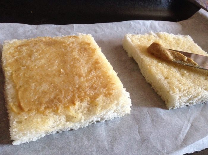 Ломтики хлеба смазать с одной стороны растопленным сливочным маслом...