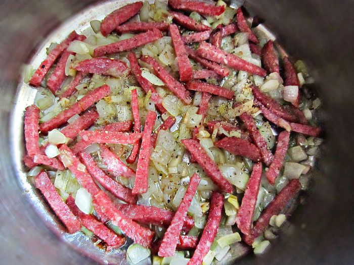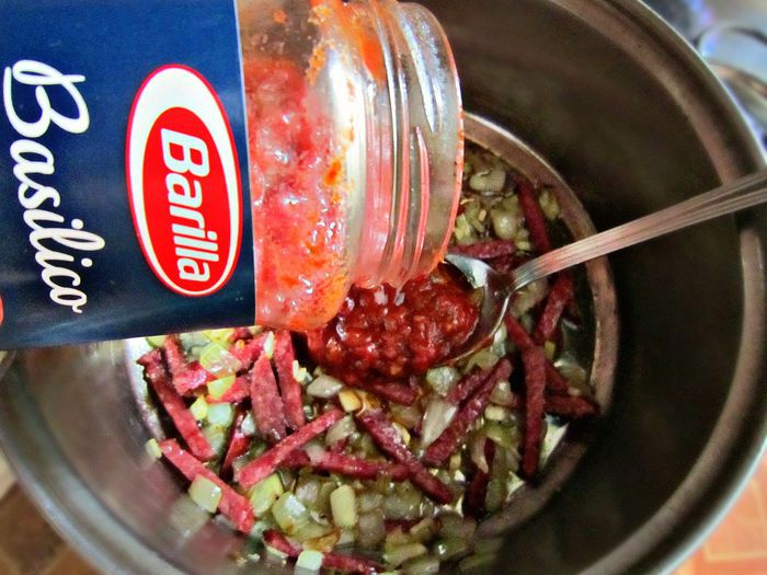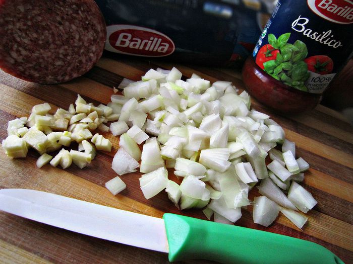 На оливковом масле слегка подрумянить лук и чеснок, добавить нарезанную колбасу и ещё обжарить всё вместе пару минут.