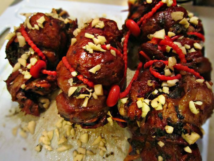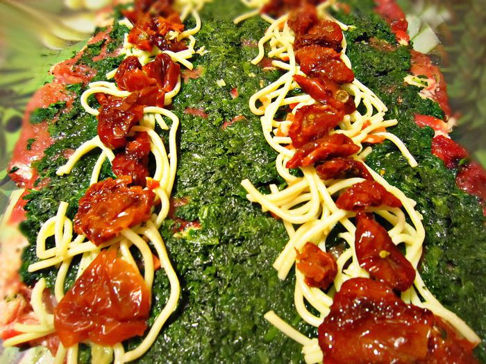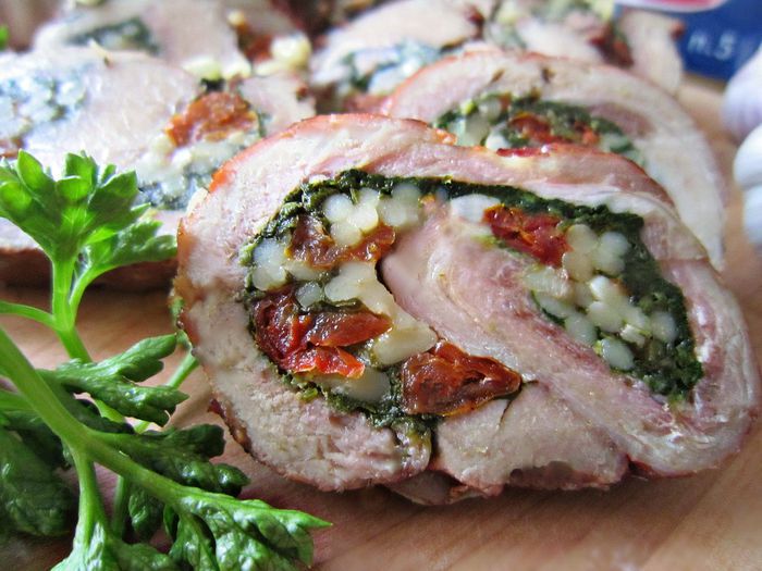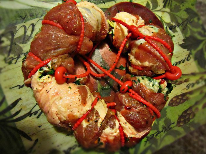 2 зубчика чеснока порубить, смешать с молотым перцем и обвалять в полученной смеси рулеты. Поместить рулеты между двумя досками, сверху положить гнёт и выставить на холод (не менее 3 ч, лучше - на ночь).