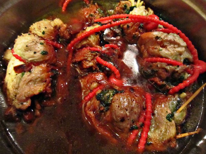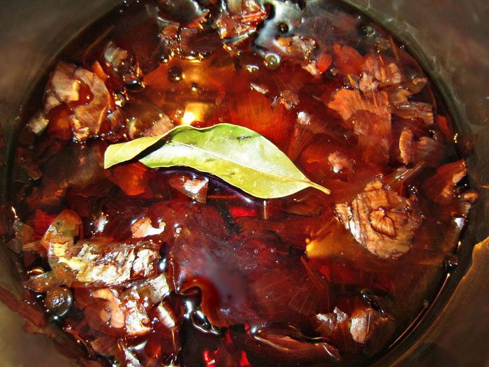 Готовые рулеты вынуть из отвара. После варки в луковой шелухе они приобретают прекрасный яркий цвет.