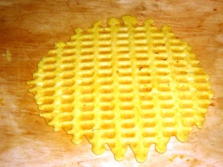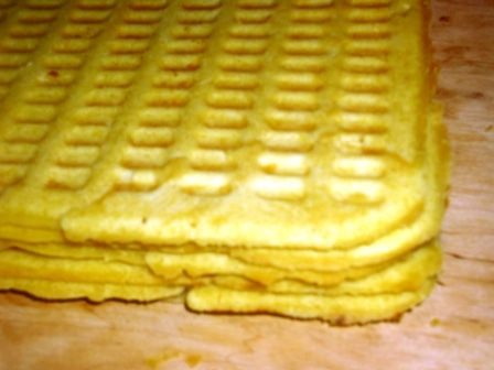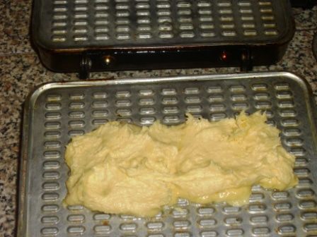 Я смазала поверхность только один раз в самом начале, тесто содержит жир, поэтому работать с ним комфортно, ничего не прилипает. Выложить две ложки теста, немного его распределить и закрыть крышку. Я её немного прижимаю в самом начале. Минуты через 3-4 вафелька готова. Важно не передержать, нам нужны нежные и мягкие коржи.