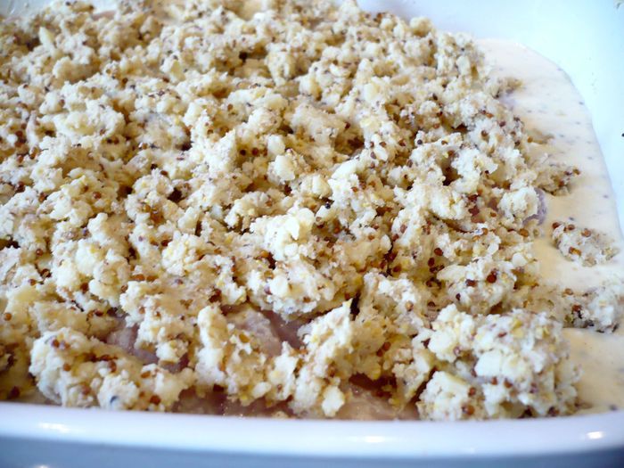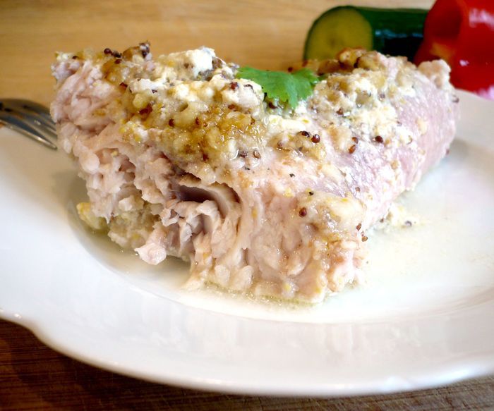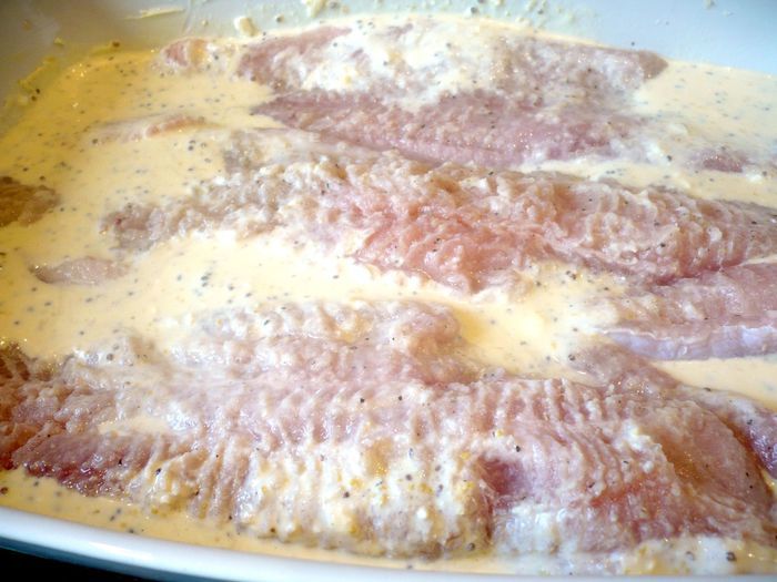 Разогреем духовку до 200 градусов. У хлеба отрежем края и измельчим хлеб в блендере. Пармезан также измельчим в блендере. Соединим пармезан, хлебную крошку, мягкое масло, 1 ст.л. горчицы. Яйцо смешаем со сметаной, сливками, 1 ст.л. горчицы, цедрой лимона. Посолим и поперчим.