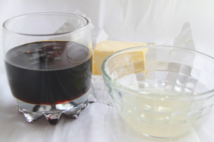 К мучной смеси добавить чёрную патоку (если нет, замените на тёмный мёд), смалец, масло.