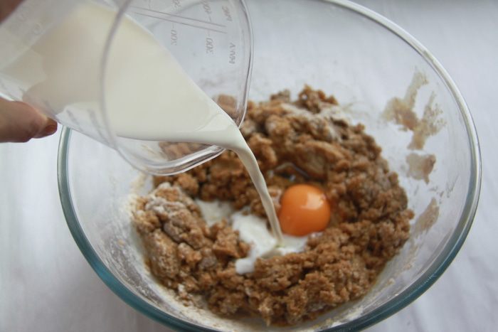 Добавить яйцо и молоко, замесить тесто.
