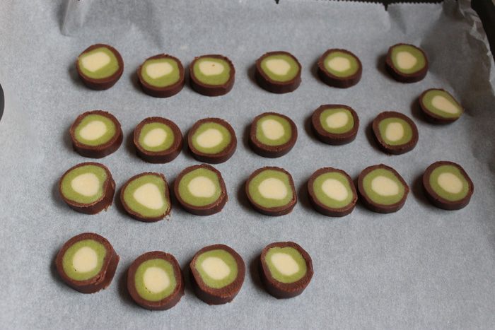 В одну часть мы добавим порошок зеленого чая. В другую какао. А меньшую часть оставим белой. Хорошо вымесим два наших теста.
