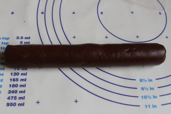 Тесто с какао также раскатываем в прямоугольник, уже 15 см шириной. Достаем с морозилки рулон и заворачиваем его в шоколадное тесто. И ставим его опять в морозилку на 10 минут.