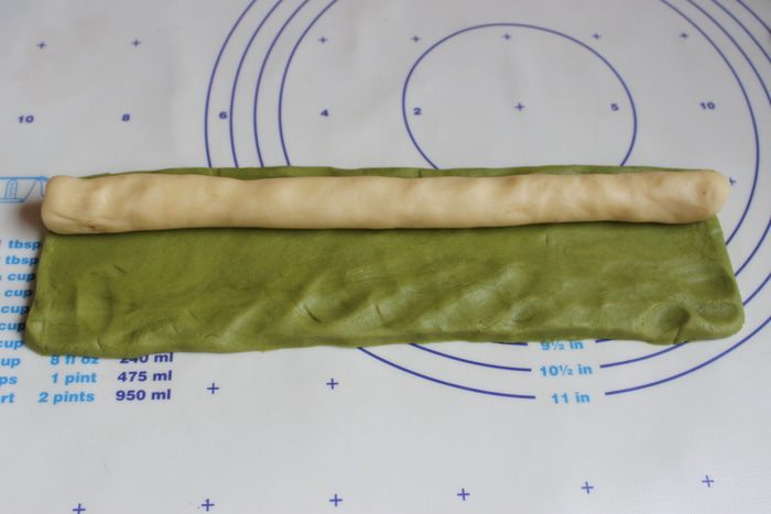 Зеленую часть раскатываем в прямоугольник, 9 см шириной. Кладем белую часть и свернем в рулон. И убираем опять в морозилку на 5 минут.