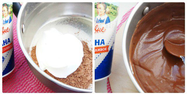 Поэтому делаем шоколадную глазурь. В кастрюльке смешать какао, оба вида сахара и сметану «Домик в деревне». Нагреть до растворения сахара, постоянно помешивая. Добавить сливочное масло, размешать, проварить 1 минуту и снять глазурь с огня.