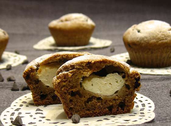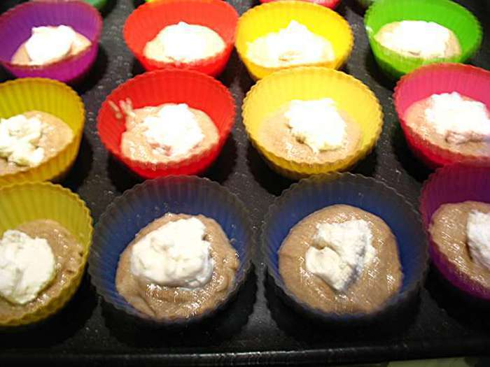 В формочки положить по 1 неполной столовой ложки ржаного теста. Сверху положить по 1 чайной ложки сливочного сыра. Сверху положить по 1 ст.л. ржаного теста. Выпекать в предварительно разогретой до 180 градусов духовке 20-25 минут. Охладить на решетке.
