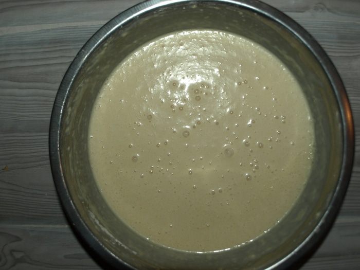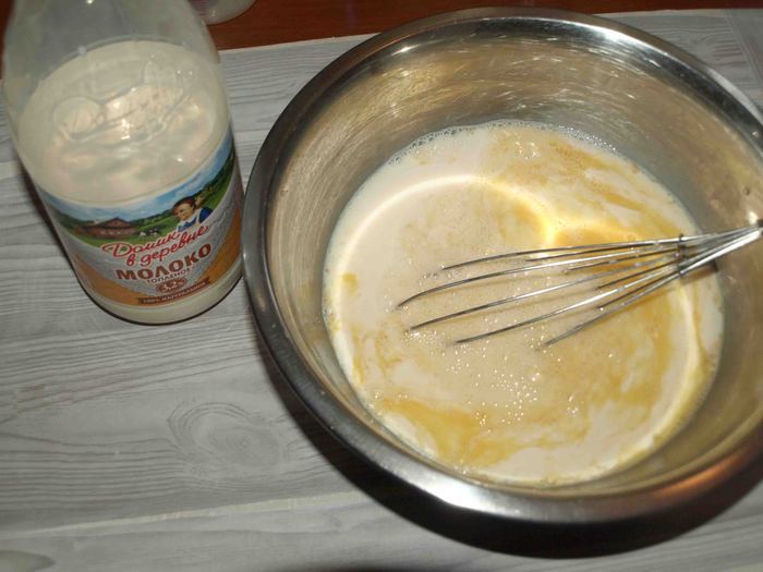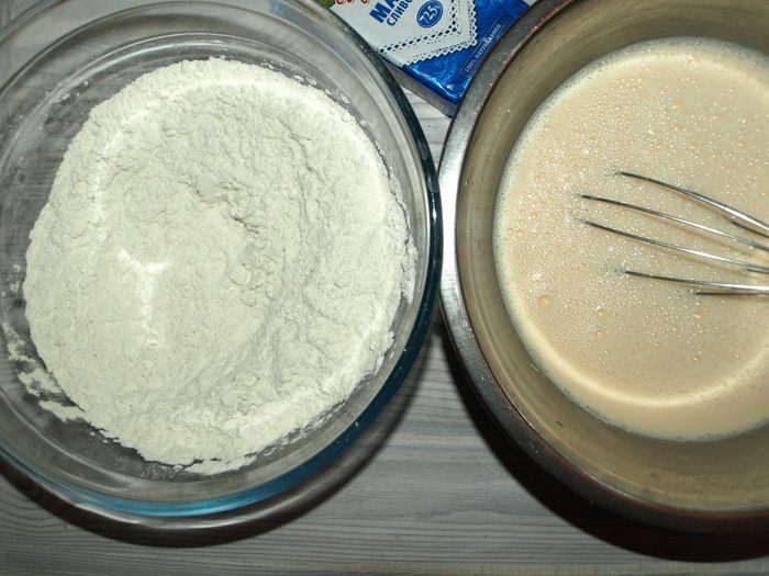 Постепенно соединяем мучную смесь с яично-молочной смесью. Тщательно взбивая, чтобы не было комочков (можно воспользоваться миксером).