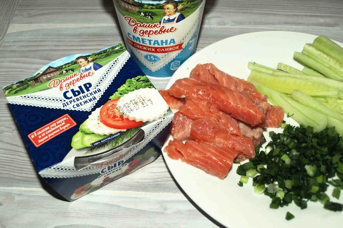 Приготовить необходимые продукты для начинки и соуса. Филе слабосоленой форели нарезать полосками, удалить все кости. Огурец очистить (при желании) нарезать тонкими полосками. Зеленый лук нашинковать