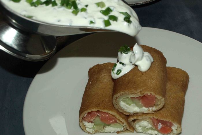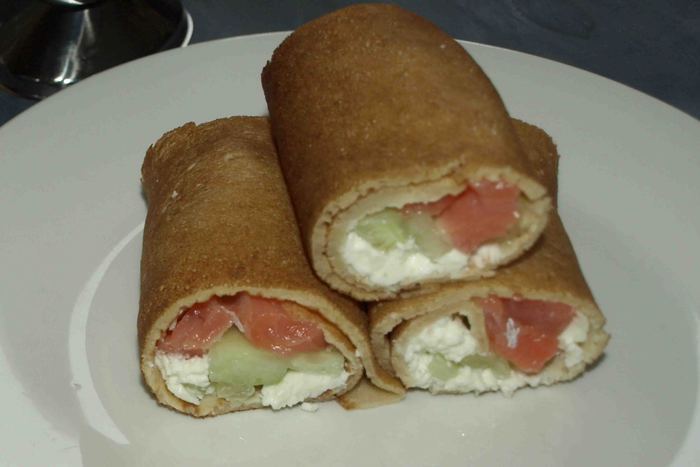 Блин намазать деревенским сыром «Домик в деревне». Сверху кладем полоски огурца, форели.