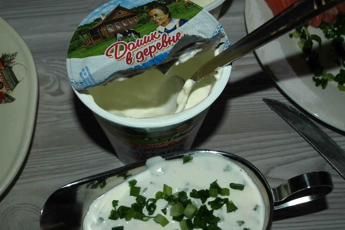 Сметану смешать с зеленым луком, посолить по вкусу.