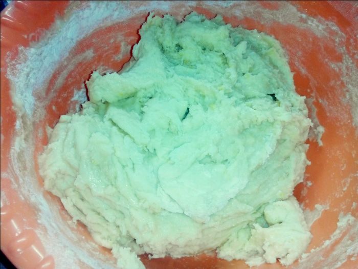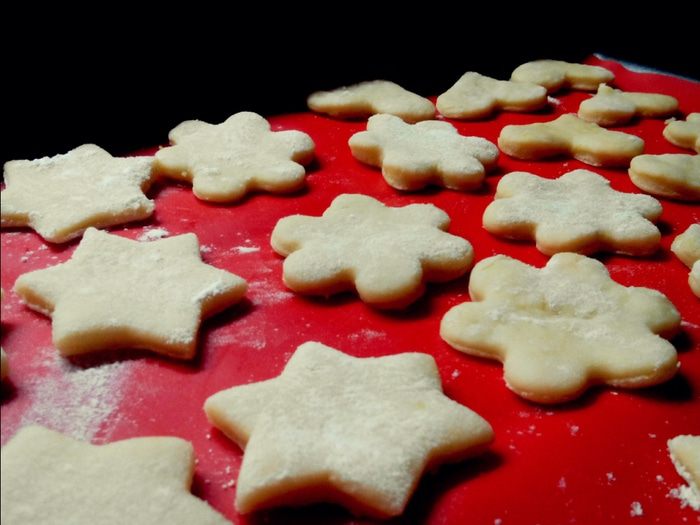 Поверхность , где будем раскатывать тесто посыпаем мукой и раскатываем тесто, примерно 0,5 см и вырезаем формочками.