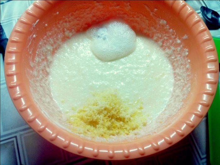 Добавляем цедру, соду и гасим её соком лимона. Всё хорошо вымешиваем.