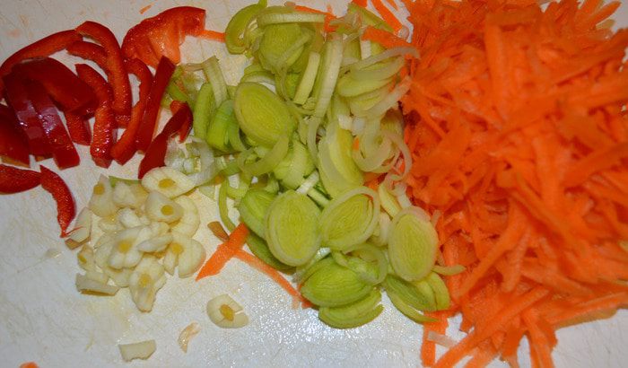 Подготовьте овощи - потрите морковь и порежьте лук, чеснок и перец болгарский.