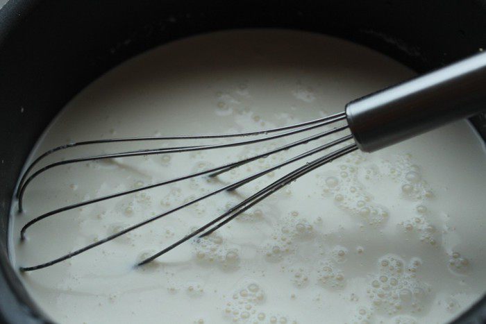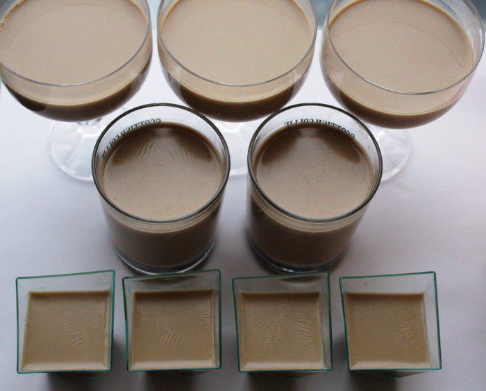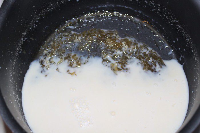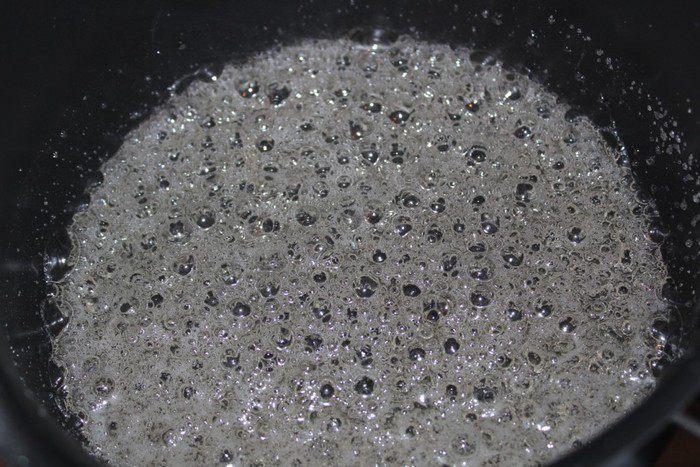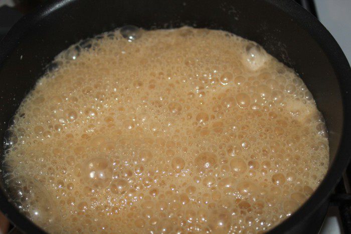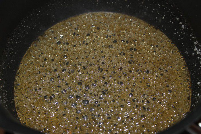 Для соуса тоффи в сковороду всыпать сахар и влить 3 столовые ложки воды. Как только сахар весь намокнет, поставить сковороду на сильной огонь и готовить до приобретения карамели золотистого цвета (мешать не следует, достаточно лёгкого встряхивания сковороды).