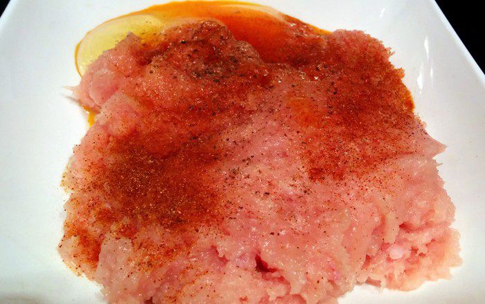 Куриное филе режем на кусочки и взбиваем в фарш в блендере, добавляем яйцо, муку, чили (можно без чили, если детки будут кушать), соль и перец.