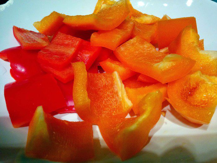 Режем болгарский перец на кусочки.