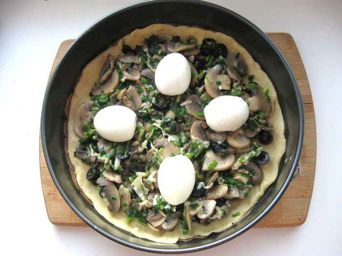 Выпекать пирог 40 минут: сначала минут 10 при температуре 210 градусов, затем при температуре 180 градусов. Через 10 -15 минут после начала выпечки сделать проколы вилкой, смазать 1 яйцом, смешанным с 1 ст.л. молока. Вынуть пирог из духовки, дать отдохнуть.