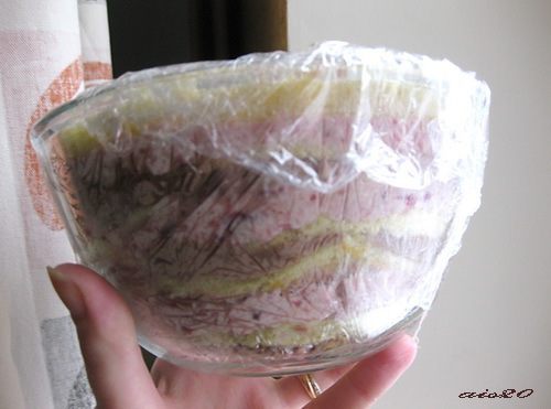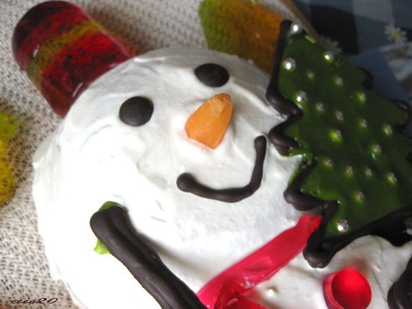 Когда желе застынет, опустить формочки и стакан на несколько секунд в горячую воду и затем перевернуть их на тарелку. У ведра из желе отсечь вдоль одну сторону, чтобы когда вы его положите на поднос для торта, оно у вас не каталось, а устойчиво стояло. Из желе, которое вынули из формочек из фольги, вырезать круглые пуговицы. Оставшееся желе нарезать полосками, из них потом будет выкладываться шарф на готового снеговика.