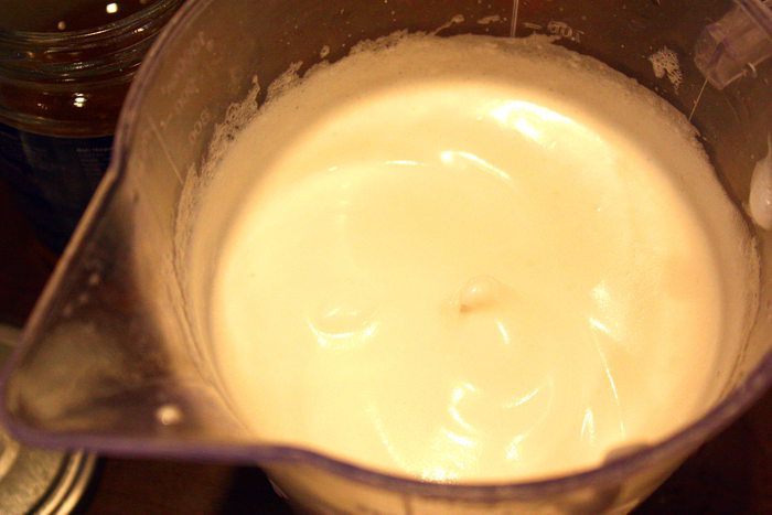 В белки добавляем щепотку соли и взбиваем до пышности, затем струйкой вливаем мед. Продолжаем взбивать до твердых пиков.