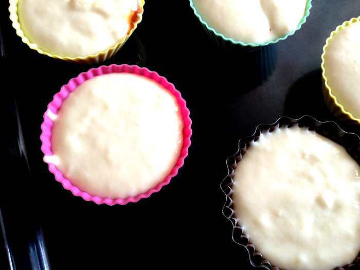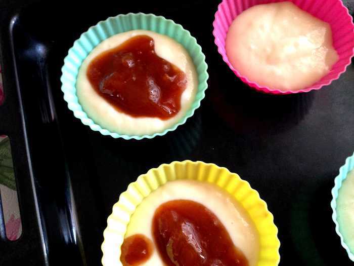 В формочки для маффинов выкладывать 1 ст.л. теста. Затем 1 ч.л. варенья...