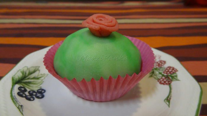 Я попробовала поэкспериментировать и добавила в часть марципана чуть больше красителя, но смешала чуть-чуть, чтобы было неоднородно. В итоге - на маффинах получилось такое вот мраморное покрытие.