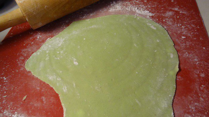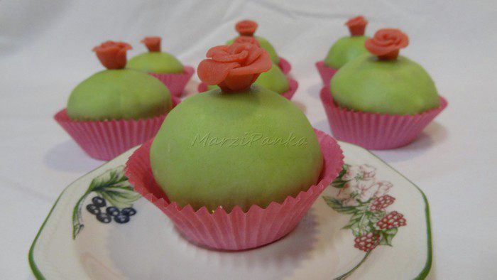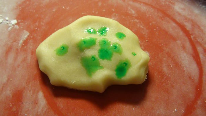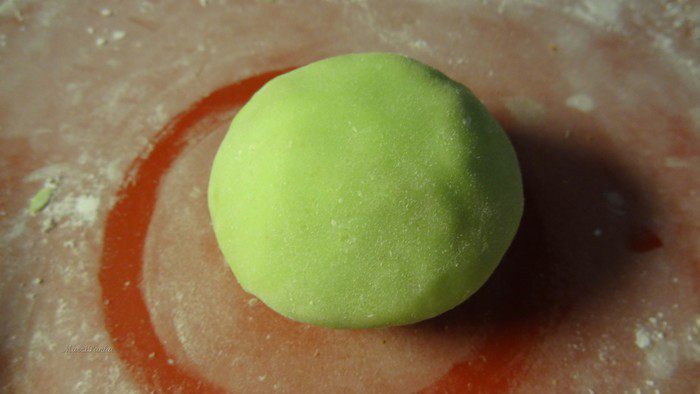 У меня не было зеленого марципана, поэтому я взяла белый и добавила в него краситель зеленого цвета.