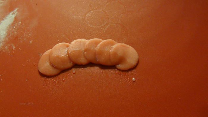 Разместим 6-7 кружочков внахлест, друг за другом. По краю пройдемся чуть-чуть водой.