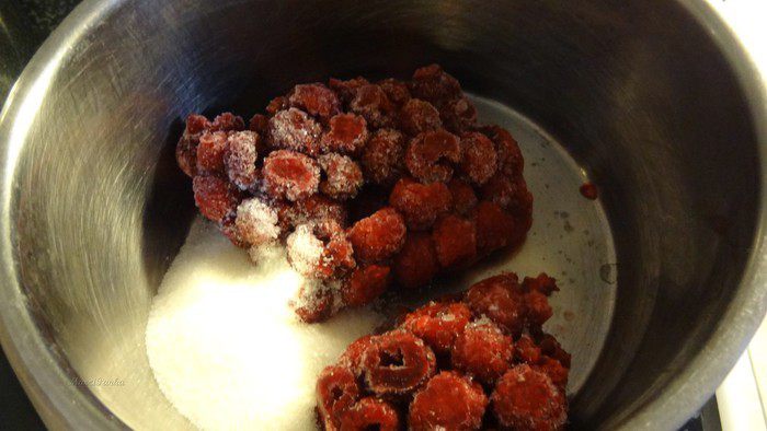 Смешать малину (у меня замороженная) с желирующим сахаром. Довести до кипения, убавить огонь и варить примерно 10 минут.