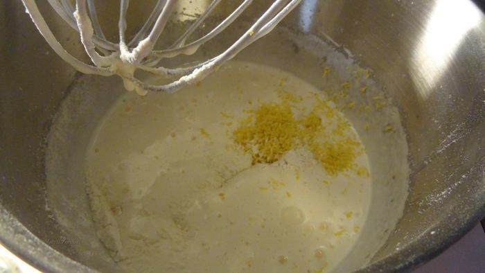 Смешать сухие ингредиенты вместе и добавить половину в яично-сахарную смесь вместе с лимонной цедрой.