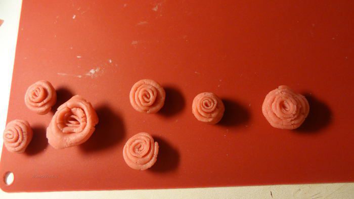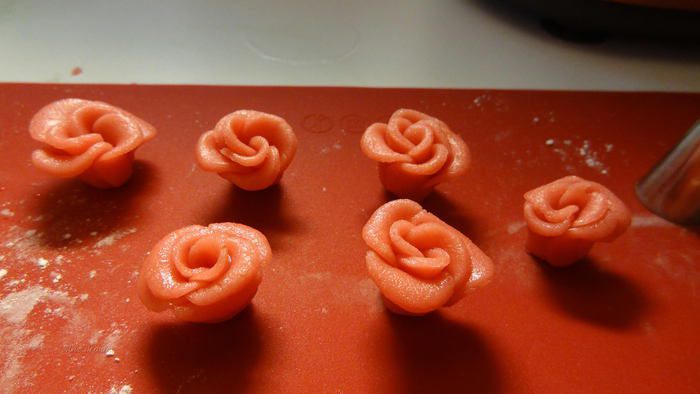 Пока маффины остывают накрутим розочек из марципана. Покажу 2 способа. У меня был марципан розового цвета. С помощью сахарной пудры раскатаем марципан