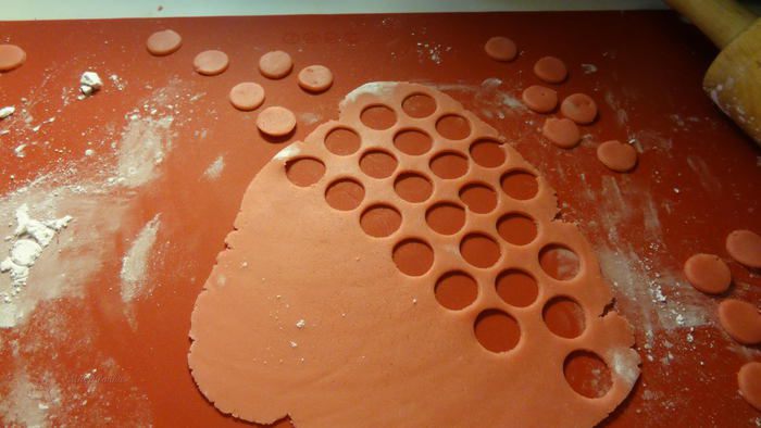 Второй способ формирования розочек. Также раскатаем с помощью сахарной пудры марципан. И вырежем маленькие кружочки. Я использовала для вырезания металлическую насадку от кондитерского шприца, т.к. розочки должны быть маленькими.