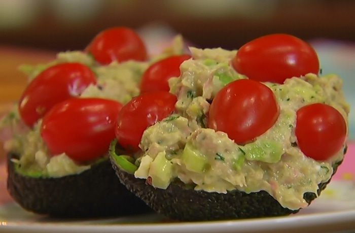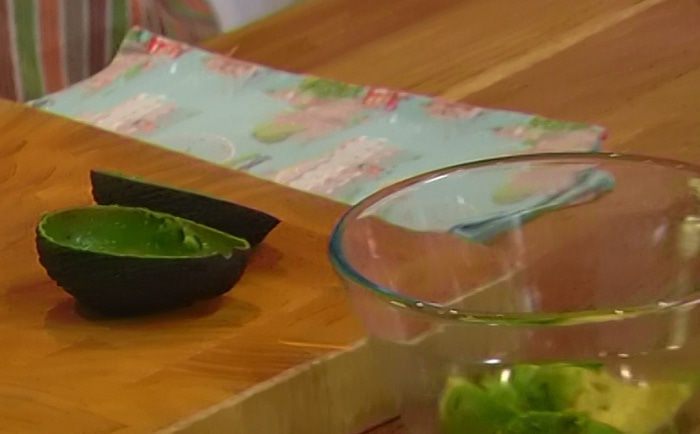 Авокадо разрезать вдоль пополам и, удалив косточку, ложкой вынуть мякоть так, чтобы чашечки остались целыми.
