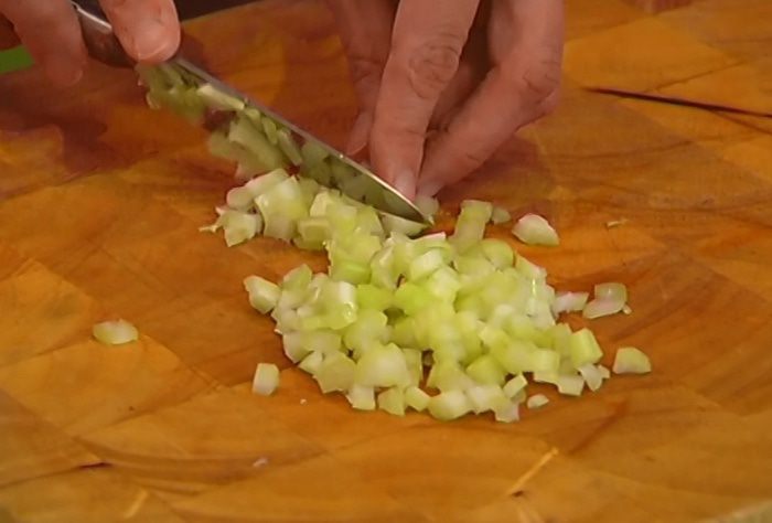 Стебель сельдерея разрезать вдоль на несколько частей, затем нарезать небольшими кусочками.