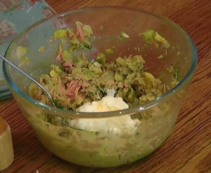 Мякоть авокадо соединить с сельдереем и тунцом, добавить майонез и все перемешать.