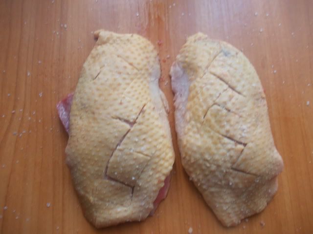 Кожу на грудке порезать крестообразно. Посолить и поперчить. Включить духовку 180 С.