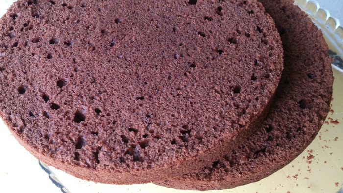 Бисквитный корж разрезать вдоль пополам.